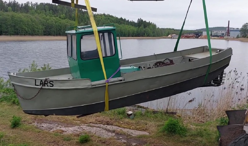 Lars sjösatt efter mer än 20 år på land. Levererades 1947 och har sedan dess gått i Mangskog och Brunskog som flottningsbåt. Åter i sina gamla farvattnen med Edanesågen i bakgrunden. Allt på båten fungerade som det skulle. FotoSven-Olof Sjöqvist 2023 07 17
