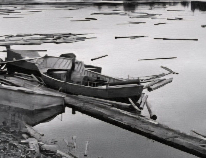 Utanför verkstaden i Österdalälven. Ingen vid rodret... Foto september 1957 i Leksands Lokalhistoriska Arkiv.