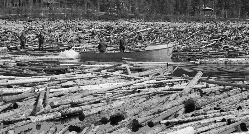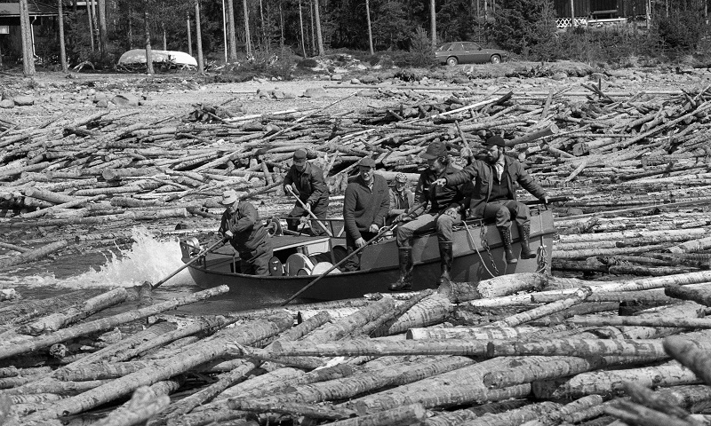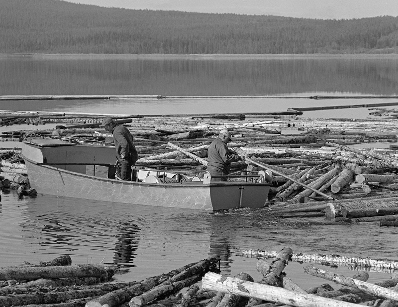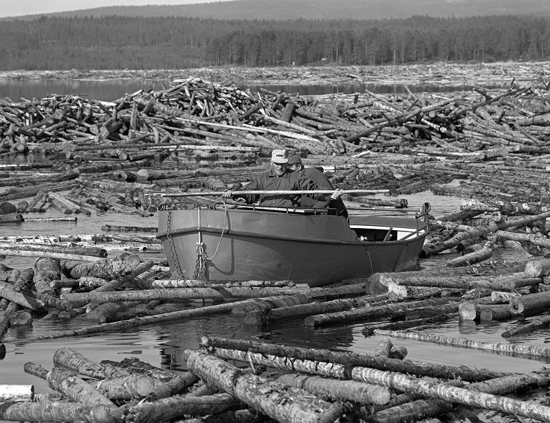Full fart framåt. Betrakta häckvågen. Båten i timret i Osmundsand i Osensjön Åmot Komun i Hedmark. Foto Ole-Thorstien Løjstad i Norsk Skogsmuseeum 1984 via Ståle Elverhøi