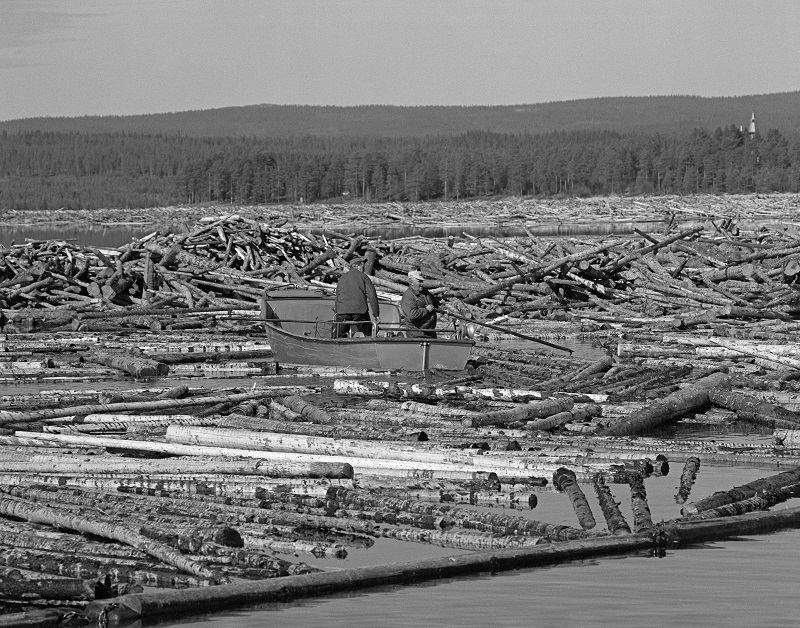 Fløterlag, fotografert mens de arbeidet med å lage en tømmerbom ved Osmundsand i nordenden av Osensjøen. Dette stedet ligger i Åmot kommune i Hedmark. Her var det fra gammelt av ei lense som fanget opp fløringstømmer fra den om lag 6 mil lange elva Nordre Osa. Da dette fotografiet ble tatt var Osmundsand en utislagsplass for tømmer som ble hentet ut fra de lokale skogene med lastebil. Når våren kom og isen gikk, ble tømmeret skjøvet ut i vannet ved hjelp av en hjullaster. Der ble det liggende omgitt av et flytende stengsel, ei landlense, inntil fløterne var klare for å overføre det til ringbommer med høvelige kvanta for buksering mot innsjøens utløp i elva Søndre Osa ved hjelp av slepebåt. Dette fotografiet er tatt under arbeidet med å klargjøre en slik bom. Vi ser fløterlaget brøyte gjennnom tømmeropplaget med en varpebåt av stål. Bak varpebåten skimter vi også en robåt. Bak robåten hang den lensa (en kjede av tømmerstokker som var knyttet sammen, ende mot ende) som skulle omslutte løstømmeret i bommen. Fløterlaget vi er på dette fotografiet besto av Martinus T. Tangen, Martinus Skogheim, Asbjørn Nordnes, Birger Rønningen, Eldar Rønningen og Roar Søberg. I bakgrunnen, på land, skimtes to hytter, en båt med kjølen i været og en bil.