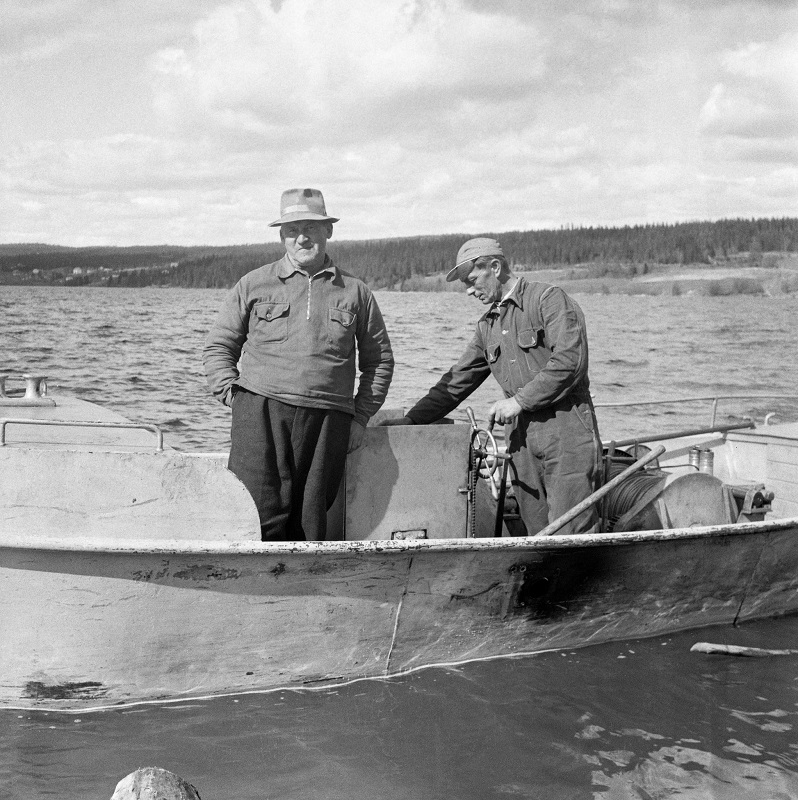 VB 10 i Osensjön i Trysil när den ännu hade Sefflemotorn. Avgasröret går ut i sidan . Foto i Norsk Skogsmuseeum.