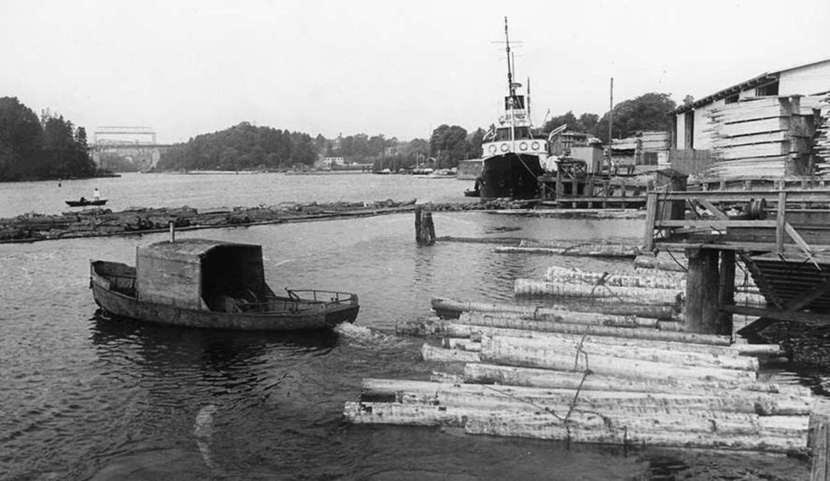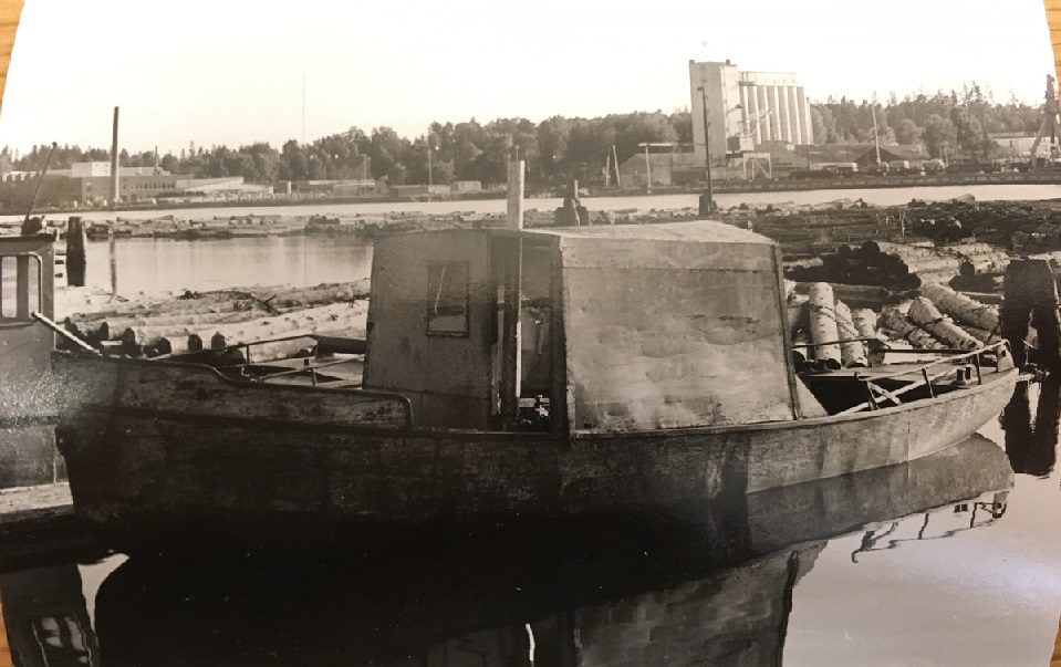 Ita I i full verksamhet vid Sågen i Södertälje. Havsbogseraren Aggö har just inkommit med ett långväga timmersläp och nu är det Ita I:s tur att sköta finliret. Okänd fotograf från nätet genom Kari Käivärainen.