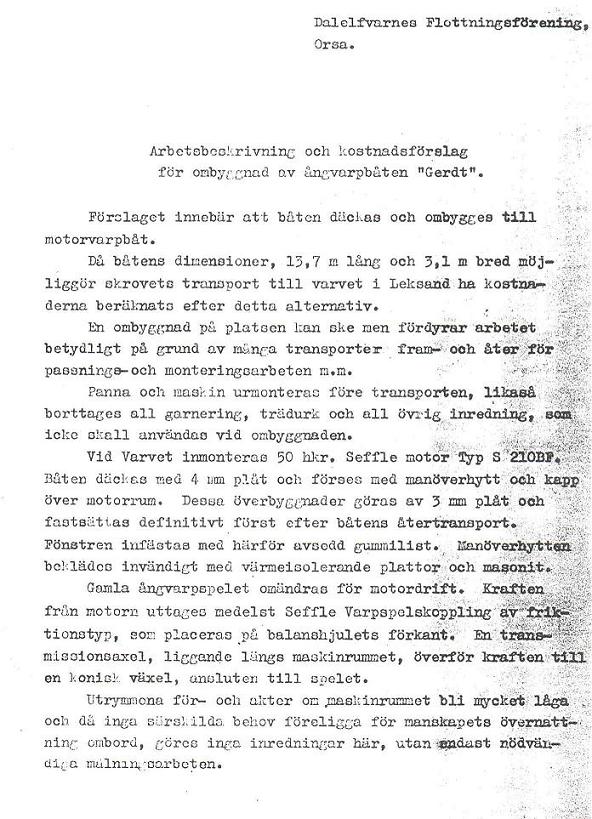 Båten trafikerade Dalälven vid Näs bruk fram till 1959 då hon istället användes nedströms på Färnebyfjärden tillsammans med ångvarpbåten Östa. Bas för verksamheten var orten Ista där slip och brygga fanns. Efter flottningssäsongen 1953 fick Lidwall & Söner AB efter sedvanligt anbudsförfarande uppdraget att motorisera och modernisera Gerdt. Då arbetet var omfattande fick båten ett eget tillverkningsnummer hos Lidwalls. De flesta ombyggnationer hos verkstaden i Leksand kallades reparenter och fick inget eget tillverkningsnummer även om arbetena i vissa fall var lika omfattande som med Gerdt