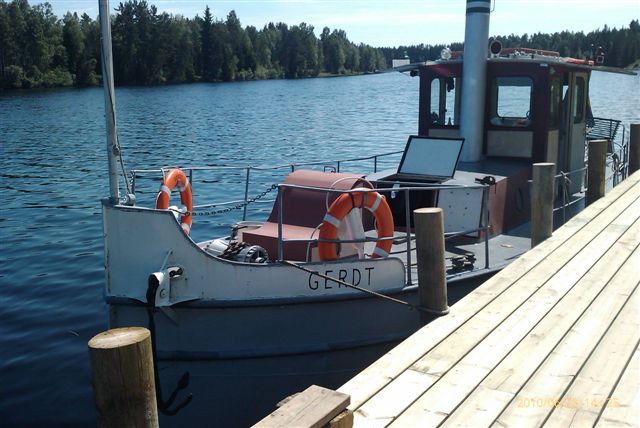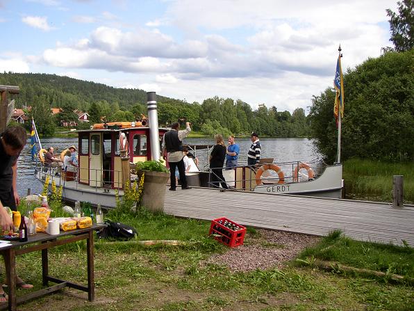 En av redaktörerna för denna hemsida, Anders Winter förvärvade Gerdt i dec 1995 och ett omfattande upprustningsarbete påbörjades. I augusti 1996 gick åter maskinen och en kort provtur kunde göras. Här firas båtens 100-årsdag vid Lidwalls tidigare utrustningskaj i Övermo by, juli 2004. Foto Erik Winter.