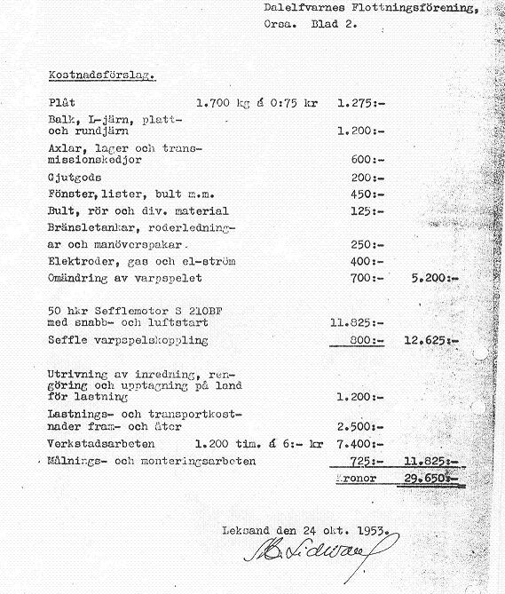 Lidwall & Söner AB levererade denna ombyggnad till Dalelfvarnes Flottningsförening i mars 1954. Längd 13,20 m. bredd 3,08 m. Trots att detta var en ren ombyggnation fick båten ett eget tillverkningsnummer.