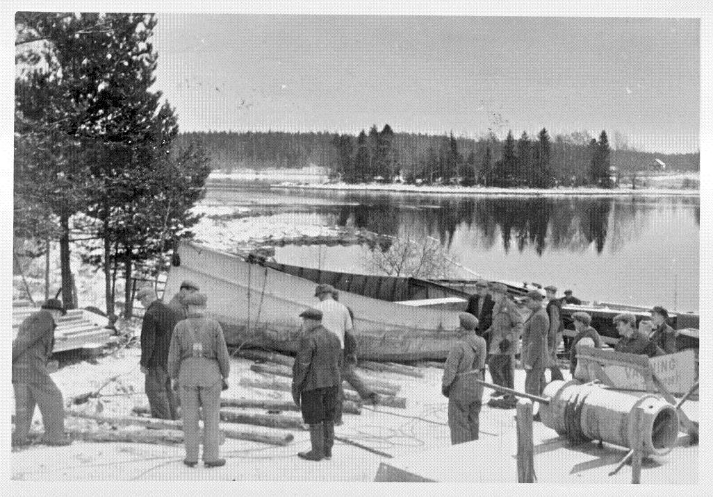 Gerdt strippad på ångmaskin, panna och varpspel. Bilden från upptagning av skrovet i Hovnäs för vidare transport till Lidwall & Söner AB i Leksand är tagen sent på året 1953. Vi har fått bilden från Per Söderlund vars far flottningsinspektor Sam Söderlund ses mitt på bilden iförd skidmössa. Observera skylten på trailern i förgrunden med texten Varning för bred last.