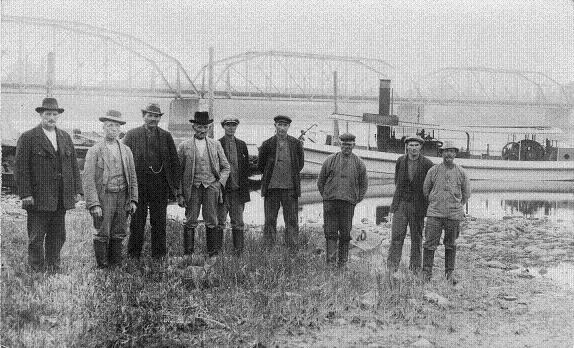 Flottare i By vid Näs bruk ca 1930 till vänster båtens skeppare. Wilhelm Ahlgren foto från Knut Dahls samling
