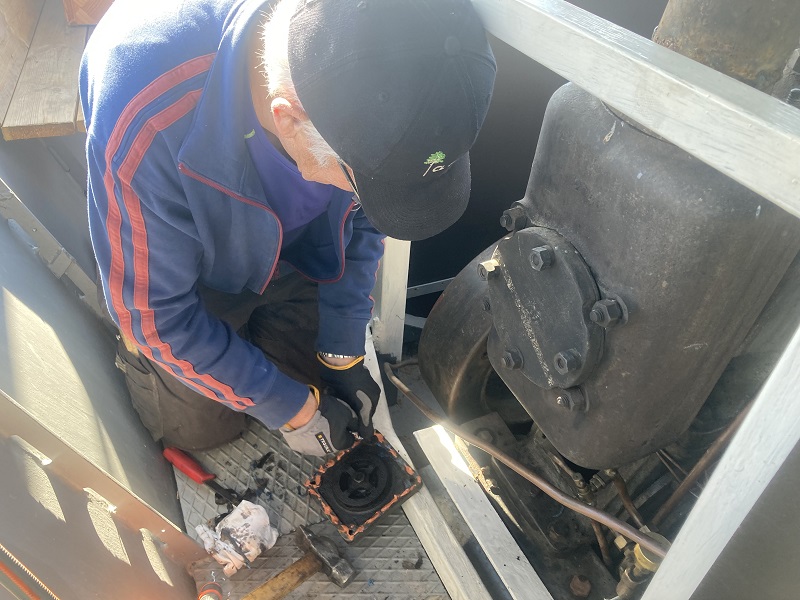 När det är tid för provkörning rycker red gärna ut. Lennart Snis kollar att vevhuset är tomt på diesel och red kollar regulatorns funktion. När det är klart är det tid att t ända gasolen. Foto Red 2021 09 14