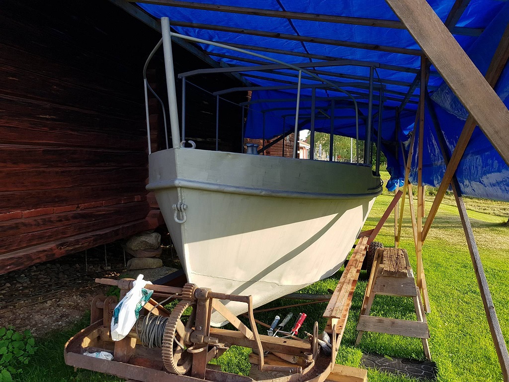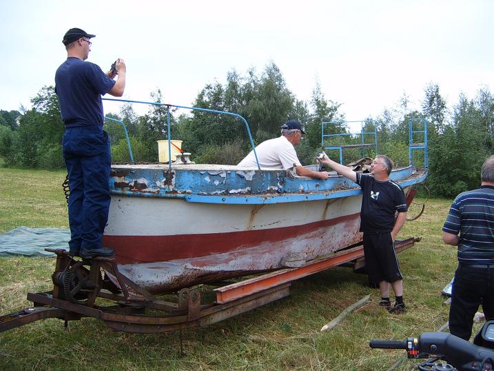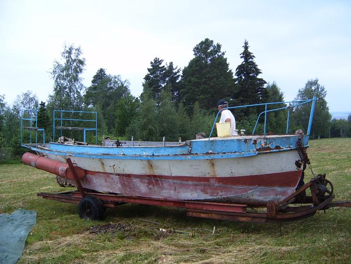Under en varpbåtsspaning 2006 långt innan Lidwallssidan var påtänkt fann vi båten i Rättvik. Hur gick det med renoveringen? Hjerpen på väg att återställas. Överbyggnaden riven. Foto red 2006 07 08 .