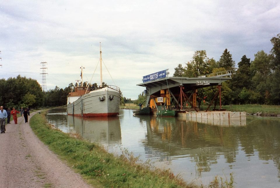 Den sista lastförande kanalbåten Svanefjord passerar en ny broklaff dragen av Göta Kanalbolagets två Lidwallsbåtar