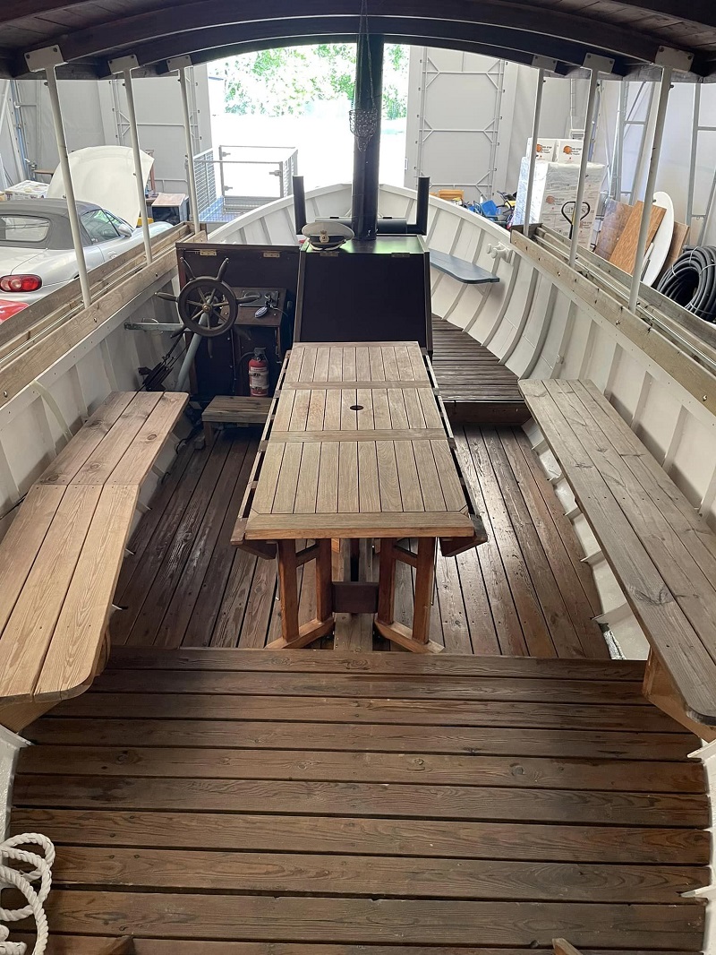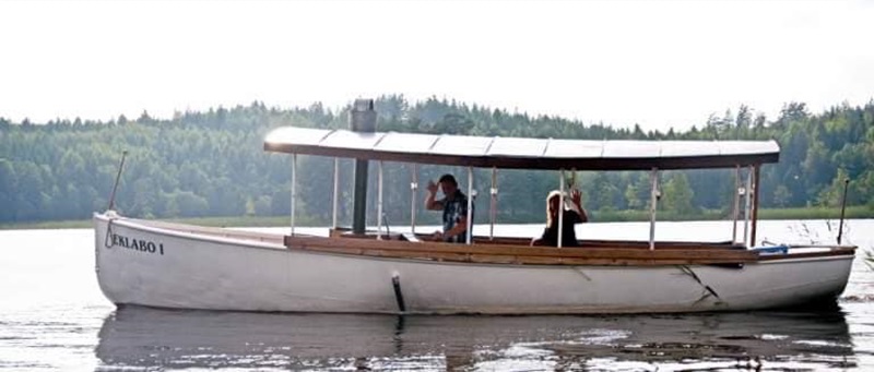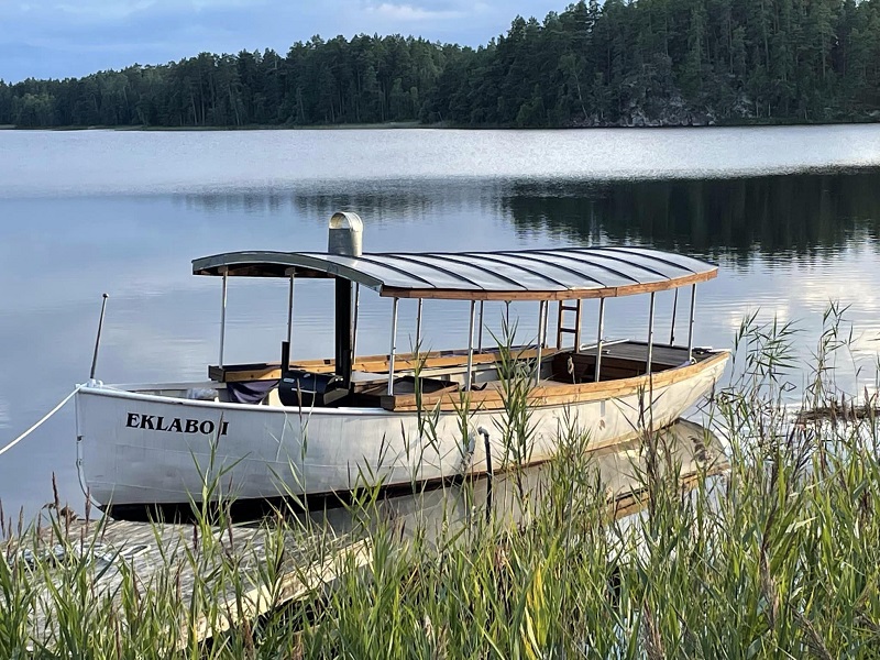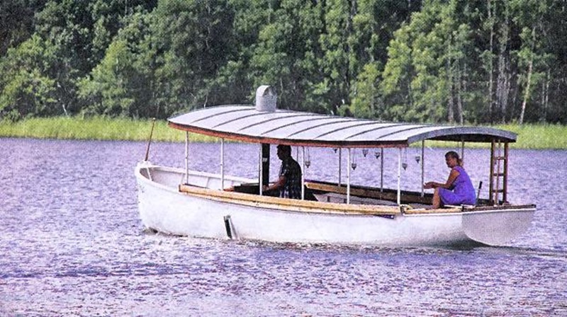 Båten har fått ett ångslupsliknande tak och planer fanns att ersätta originalmotorn med en ångmaskin. Båten heter här Eklabo I . Sommen i juli 2011. Foto Göran Palmqvist. Inskannad från tidningen av red och tillfixad.