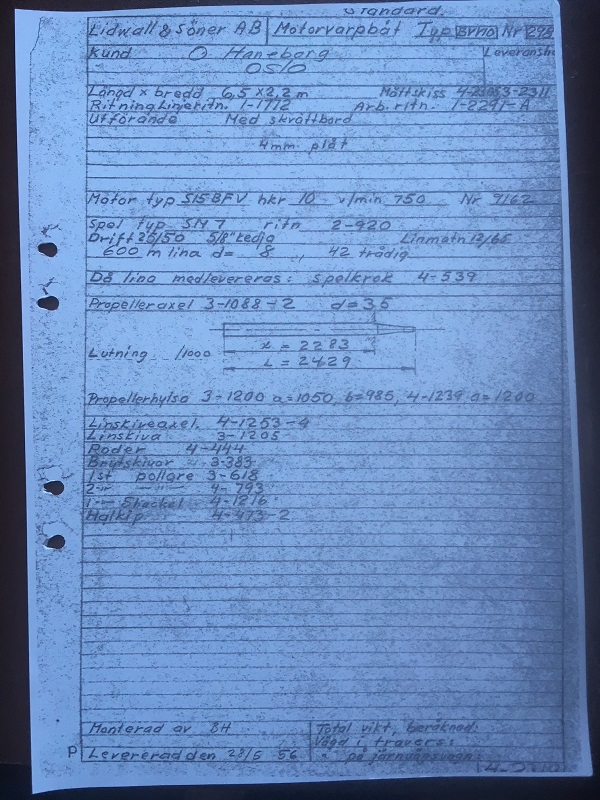 Lidwall & Söner AB levererade denna motorvarpbåt till O. Haneborg A/S i Oslo den 28 maj 1956 O. Haneborg A/S var Lidwalls agent i Norge. Båten vidaresåldes till Glomma Felles F.F. Vinstra Båten fanns kvar 2018 i trakten av sjön Osen. Längd 6,40 m. Bredd 2,20 m. I orginal Seffle 10 hkr tändkulemotor typ S15 BFV med motornummer 9162 och ett varpspel typ SM7 för 600 meters 8 mm lina. Båten byggdes med skvättbord och i 4 mm plåt. Båten är den sista av typen spantbyggda BVV-10 båtar som såldes till Norge, Efter denna byggdes ytterligare åtta BVV 10 med spant men de såldes alla inom Sverige utom den sist byggda nr 338 som gick till Norge.