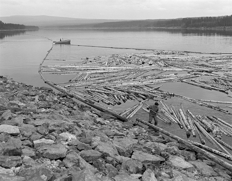 Tappning av timmer i Löpsjödammen Löpsjön.1984 Båten är troligen nr 298 på denna bild från Norskt Skogsmuseum Foto Ole Torstien Ljöstad
