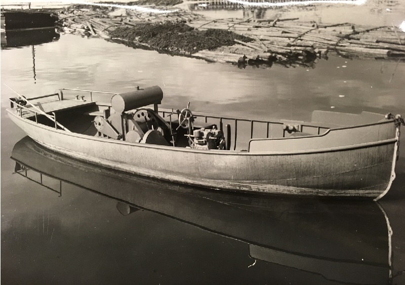 - Båten på bilden har en BM 1052 motor. Det har flera personer som sett bilden bekräftat. Det utesluter alla båtar byggda med andra typer av motorer. Båten är öppen och utan hytt, Sådana uppgifter finns antecknat på tillverkningskorten. Tanken sitter på spelet. Även det är antecknat på kortet. Båten är byggd i fartygskvalitét, alltså byggd på att gå i saltvatten. På bilden ses i bakgrunden timmerbuntar som inte förekommer på insjöar eller älvar.Vi kan även se aktern på en pråm och stora buntar med kättning som används för att just bunta timmer för havsbogsering. Holmens Bruk hade anläggningar på flera platser längs kusten. Vi vet dessvärre inte vart båten levererades. Kunskap om detta skulle kunna stärka eller kullkasta om båten på bilden är just nr 304
