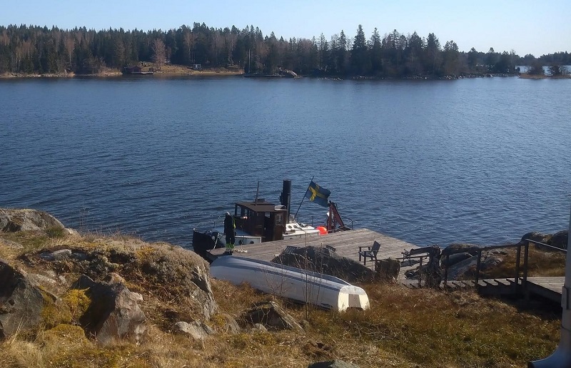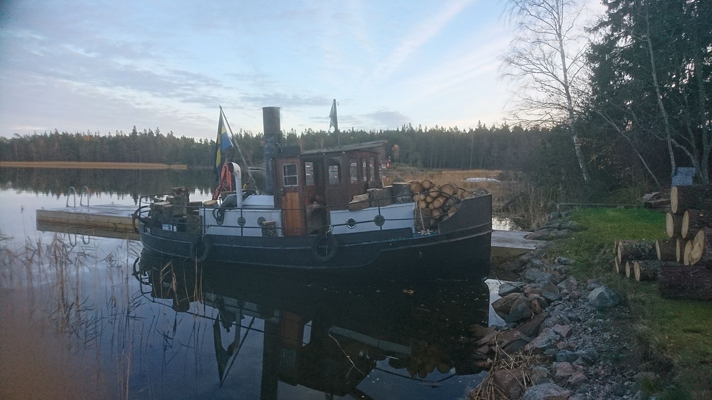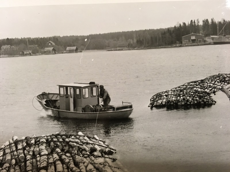 Hytten tillhör båten på bilden från Fagerviken. Den är på väg ut med en björkflotte från Modos flottläggningsplats här i Fagerviken. Den större lastbåten du ser längre bort är vid Fagervikens hamn där det anlöpte upp till ett femtiotal lastbåtar per år på femtiotalet och det pågick en bit in på åttiotalet. Det lastades ut träfiberplattor från Karlit vid Karlholms Bruk, sågade trävaror från Elinge och Nyby Sågar. Gödning och säd lagrades i magasinet du ser framför lastbåten.