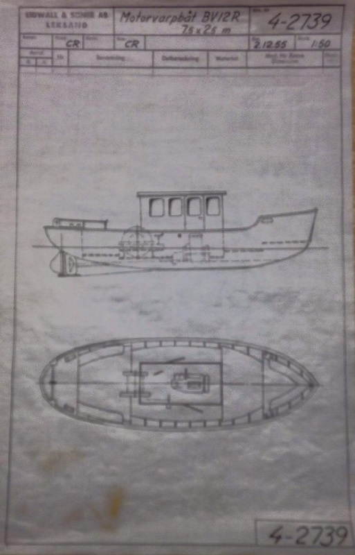 Lidwall & Söner AB levererade denna varpbåt till Mo & Domsjö AB i Örnsköldsvik den 26 april 1957. Båten byggdes odäckad med styrhytt, förlängd vågbrytare och hade notchade spant. Motorn var av typen BM 1052 BR 57 och hade tillverkningsnr 3601. Den var försedd med självstart, dvs eldriven startmotor. Propellern hade en diameter av 575 mm och båten var försedd med ett spel av typen SM 10 som rymde 700 meter 12 mm lina.