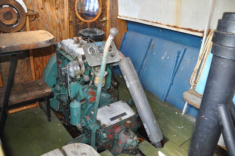 Den luftkylda 3 cylindriga Listermotorn och notchade spant. OBS bogserkroken i bildens högra sida. Foto Göran Eriksson sept 2015.