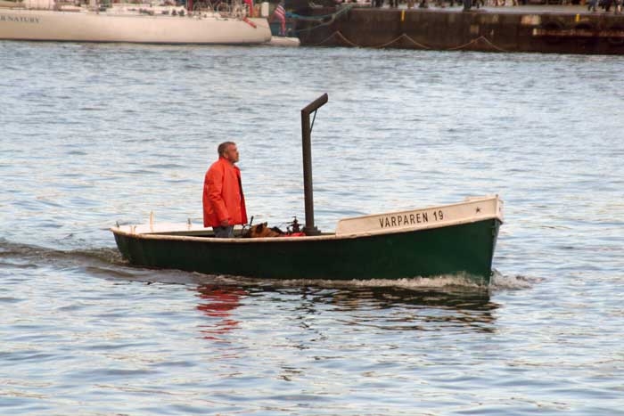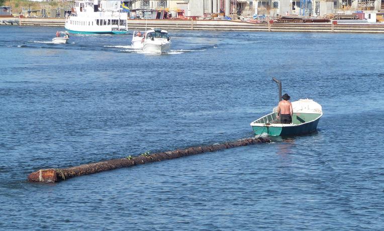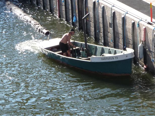 2010 07 14 drog Varparen 19 ett mastämne från Mälaröarna till Beckholmen, en färd på ca 5 timmar. Odd ringde och förvarnade sin ankomst till Hammmarbyslussen så att red kunde komma loss och fota denna sentida och unika flottning/timmerbogsering. Red cyklade runt kanalen och såg hur hela personalen på en krog lämna stekbord och slevar för att ställa sig på kajen och bara lyssna. Ännu kan en Lidwallsbåt från 1948 göra god nytta och sprida glädje i huvudstaden.