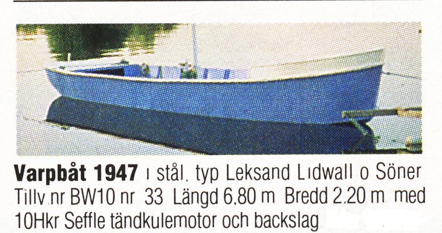 Lidwall & Söner AB levererade denna motorvarpbåt till Klarälvens Flottningsförening den 24 april 1948 . Längd 6,40 m. Bredd 2,20 m. Seffle 10 hkr tändkulemotor med motornummer 6196 och varpspel. Troligen hette båten Varparen 7 från början då det är den andra Lidwallsbåten som köptes ny till KFF. Det bekräftas av en lista på KFF:s båtar som red. erhöll från säker källa 2015.