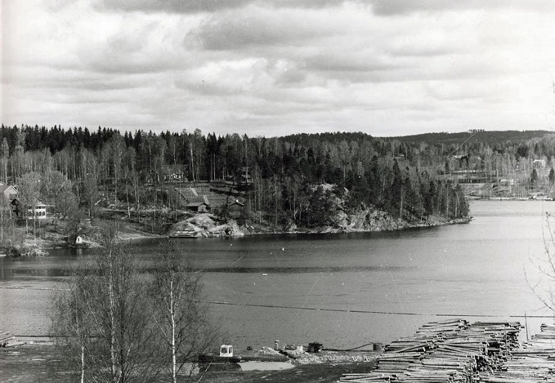 Fotot är taget omkring 1990 av Torsbyfotografen Tord Särnmark, på uppdrag av Fryksände hembygdsförening, vars hembygdsgård Kollsberg ligger på "andra sidan" av viken. I förgrunden ser vi Notnässågens timmerupplag som vid den tiden flyttat upp på land. Motorvarpbåten Sven ligger vinterupplagd på stranden. Framför båten kan man se en nygrävd ränna vilken red tror skall användas för att lägga ned ett sugrör till bevattningsanläggningen. Foto Håkan Larssons Samling