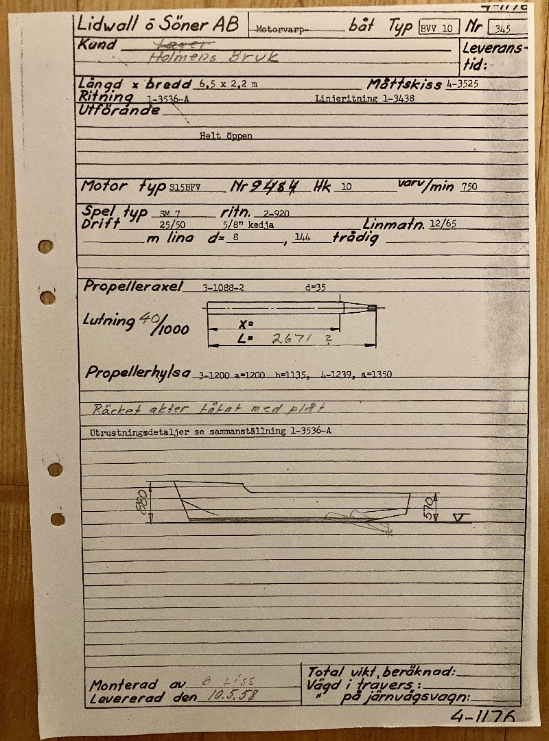 Lidwall & Söner AB levererade denna motorvarpbåt den 11 Juni 1958 till Holmens Bruk AB i Norrköping. Längd 6,1 Bredd 2,3.Motorn var en Seffle typ S15 BFV på 10 hkr med motornr. 9434. Varpspelet var av typen SM 7 för 8 mm lina . Båten var den första BVV-10 med det moderna spantlösa skrovet som byggdes enligt ritning 4-3681.Byggdes utan beställare = Lager