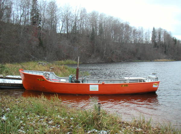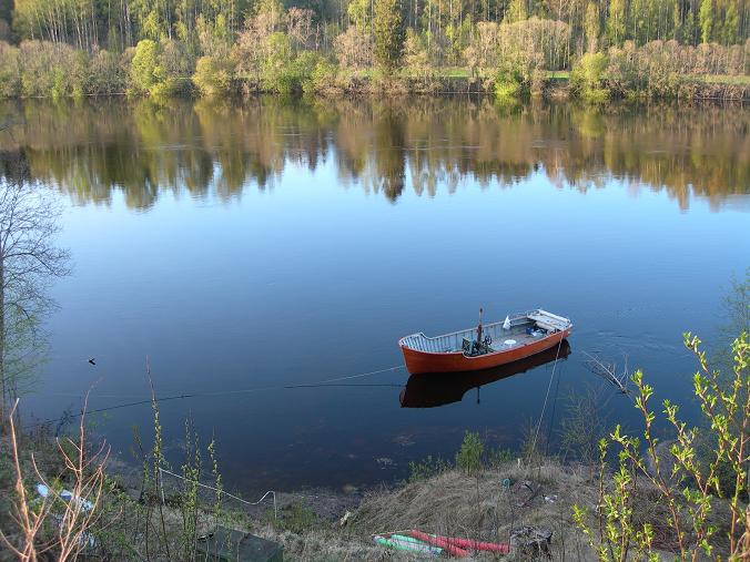 Högvatten i Dalälven maj 2008. Bryggan under vatten. Båten är i fint bruksskick och i drift varje år. foto Lars Dikander