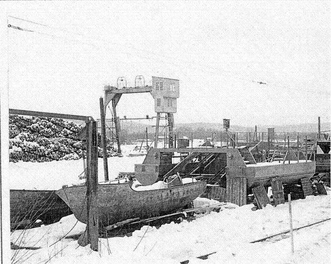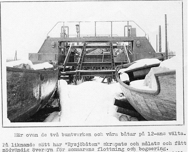 En bild från Kvarnsvedens timmerupplag vårvinter 1960. I förgrunden ses Bysjöbåten och bakom den ett timmerbuntverk , troligen tillverkat av Lidwalls & Söner AB även det. Under januari 1960 var det isfritt i Dalälven och då drogs hela 563 buntar från magasinet i Bysjön fram till pappersbruket av Bysjöbåten. Foto fr Lars Dikanders samling.
