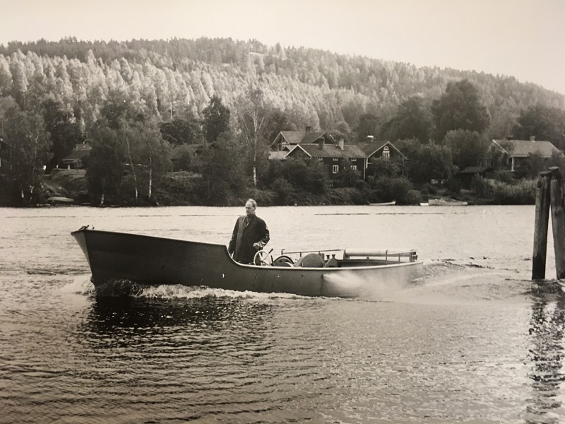 Utanför verkstaden i Österdalälven. Ingen vid rodret... Foto september 1957 i Leksands Lokalhistoriska Arkiv.