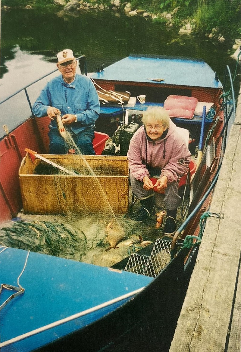 Känns båten igen ? Allan och Kerstin Pettersson, Blåvik rensar näten efter fiske i sjön Sommen juli 2000 . Foto i bok om Sommen förmedlat av Eric Hektor