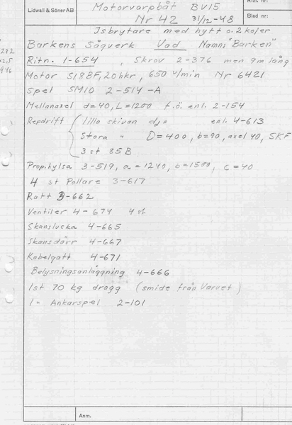 Lidwall & Söner AB levererade denna motorvarpbåt till Barkens Sågverk AB den 31 december 1948. Längd 9,00 m. Bredd 2,50 m. Båten hade en Seffle 20 hkr tändkulemotor typ S18 BF med motornummer 6421. Namnet varBarken.Båten byggdes för isbrytning och kalladesIsbrytare med hytt och 2 kojer i leveransdokumentet. Sågverket låg vid Vad i Södra Barken. Idag är det en trafikplats där sågen låg. Det medföljande ankaret vägde 70 kg enligt leveransdokumentet. I början av 1970-talet låg båten upplagd vid resterna av det då nedlagda sågverket.