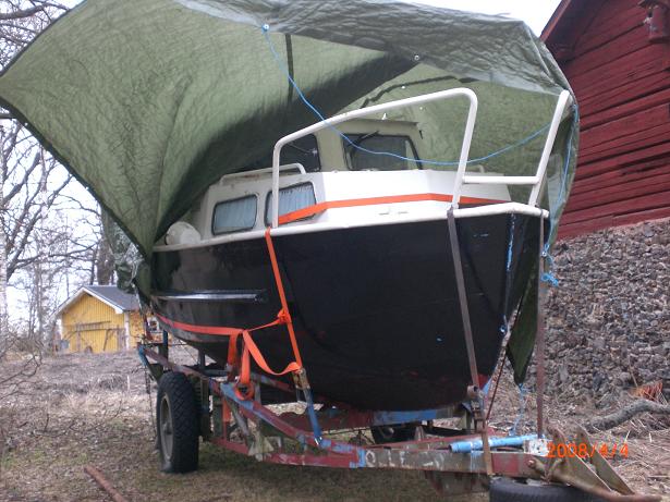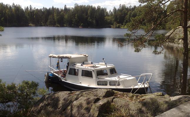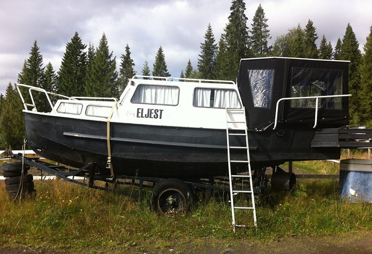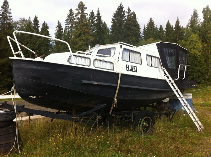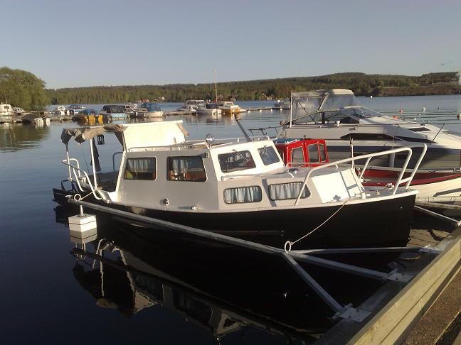 I Laxsjö med ett passande namn. På den här bilden syns det tydligt vad red såg första gången. Att båten är påbyggd midskepps med en plåt för att få en rak däckslinje. Foto Stig Holm 2016 08 28