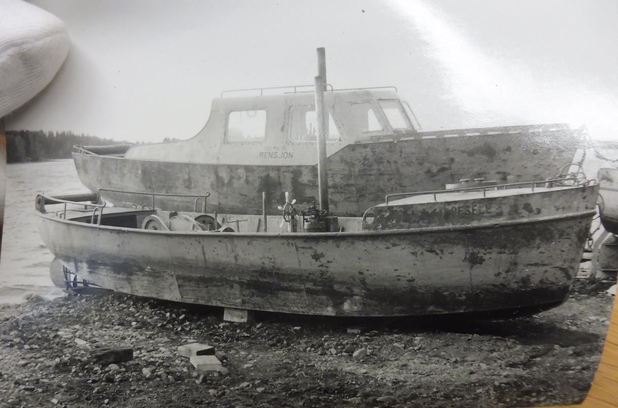 Det uttyds Motorvarpbåt nr 159 byggår 1949 och så namnet RESELE. Om det fanns något kvar av denna båt hade vi då ingen aning om men red var tämligen säker att det är just nr 54 som ses på dessa bilder. En typisk tidig BVV-10 båt utan skvättbord. Lidwalls byggde flera båtar som beställdes till vattenkraftverk efter Ångermanälven och som senare kom att ingå i ÅFF:s flotta. Vi hoppades givetvis att hon skulle finnas kvar. Många BVV 10 har blivit omhändertagna efter avslutad tjänst.
