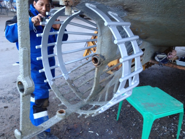 ”Efter att ha blästrat och primat båten förra året har vi fortsatt renoveringen med att byta propelleraxel och propeller, samt kompletterat timmerkorgen. Och så har båten fått lite färg också. Här kommer lite bilder från senaste veckans jobb. På tisdag 20 nov 2012 skall hon tillbaka i vattnet för en ny issäsong. Lägg märke till att primern som lades på efter blästringen 2011 (Intershield 806) var helt intakt, även i fören, trots flera veckor i isen. Den nya propellern har originaldimensionen, men är i brons till skillnad från den gamla stålpropellern som var svårt rostangripen. Stävlagret var i OK skick, så det får vara kvar ett tag till.