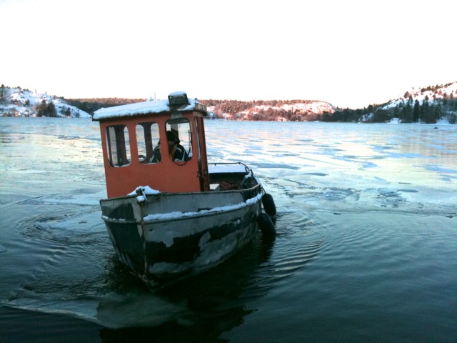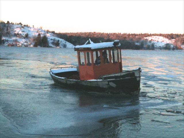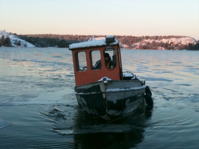 Här några bilder på båten tagna -2010 -12 -10 - när vi bryter isränna. Syns tydligt att båten har en permanent slagsida, då styrhytten inte sitter i mitten. Vi har inte gjort annat än att återställa glödsystemet och bytt batteri. Motorn går som en klocka och det går framåt trots den rostiga järnklumpen till propeller. Isbrytningskapaciteten är rätt så bra den också, bara man tar sats;-) Men så är ju båten isförstärkt (timmerförstärkt) också. Vi ser fram emot helrenovering nästa sommar.