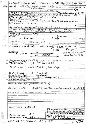 Lidwall & Söner levererade denna bogserbåt till Högboda industrier i Töcksfors den 28 januari 1966. Längd 7,00 m. Bredd 2,20 m. Orginalmotorn var en Deutz typ F2L 514 på 25 hkr. Styrhytten var inte helt centrerad enligt leveransdokumentet nedan. Båten var byggd som en ren bogserare och saknade spel. Plåttjockleken i skrovet var 4 mm, i bogarna 5 mm. Beräknad vikt vid leverans 3,5 ton