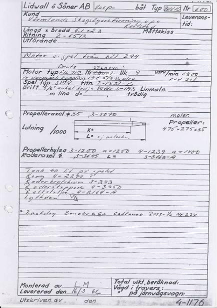 Lidwall & Söner AB levererade denna varpbåt till Värmlands Skogsägareförening i Karlstad den 16 mars 1966. Längd 6,10 m. Bredd 2,30 m. Orginalmotorn var en Deutz av typ F1L 712 på 9 hkr från 1961. Både motorn och spelet kom från en äldre Lidwallsbåt med tillverkningsnr 294 Det var en typ SV-3 som kan ses här. Totalvikt med spel och lina var 2150 kg. Båten levererades till Knappåsens Sågverk och gick på sjöarna Brevistan och Busjön.