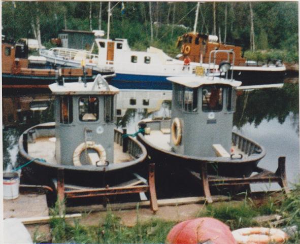 Sjötraktor nr 604 Svartviktill vänster i bild. Till höger Gåsen nr 719. Foto genom Bengt Sandinge taget 1987 vid Hästvikens varv i Vänern