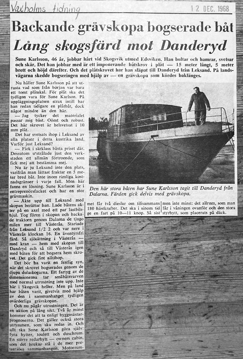 Här går det att läsa om den spännande transporten från Leksand till Västeråsoch ar som föranledde Sune Karlsson att beställa i Leksand - De var helt enkelt billigast och bäst. Troligen inte möjligt att genomföra i senare tider. Waxholms tidning 1968 12 12 urklipp i Gunnar Hedmans samling.