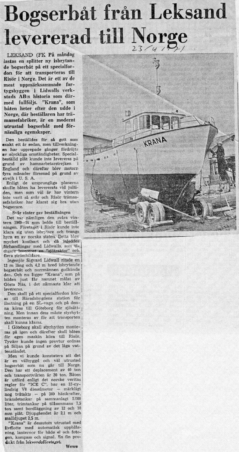 Lidwall & Söner AB levererade denna isbrytande bogserare till Risørs Trämassefrabrik i Risør Norge i april 1971. Längd 13,00 m. Bredd 4,20 m.Vikt 30 ton. Motorn var en Detroit Diesel på 340 hkr.