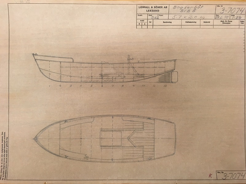 Lidwall & Söner AB levererade denna bogserbåt till Statens Skogsindustrier i Laxå 14 augusti 1970. Längd 5,70 m. Bredd 2,00 m. Motorn var en Albin Diesel-21 på 22 hkr med tillverkningsnr 560 35. Båten var byggd i 4 mm plåt i förskeppet, övriga skrovet i 3 mm. Båten hade en motorhuv i plåt och två stående rundjärn i aktern som begränsade bogsertrossens vinkel.Tanken var på 40 liter och utförd i 1,5 mm plåt Motorn var försedd med en Calix motorvärmare på 500 watt och hade kölkylning. Vi vet inget mer om denna båt , den sist tillverkade av BV 5 typen men förusätter att den var tänkt att brukas året, runt pga motorvärmaren och det slutna kylsystemet. Vi vet inte heller var den gick i trafik.