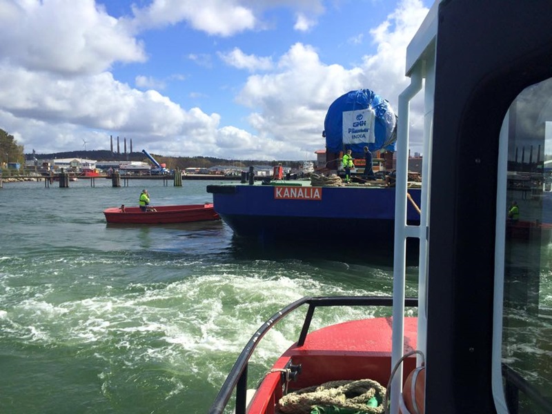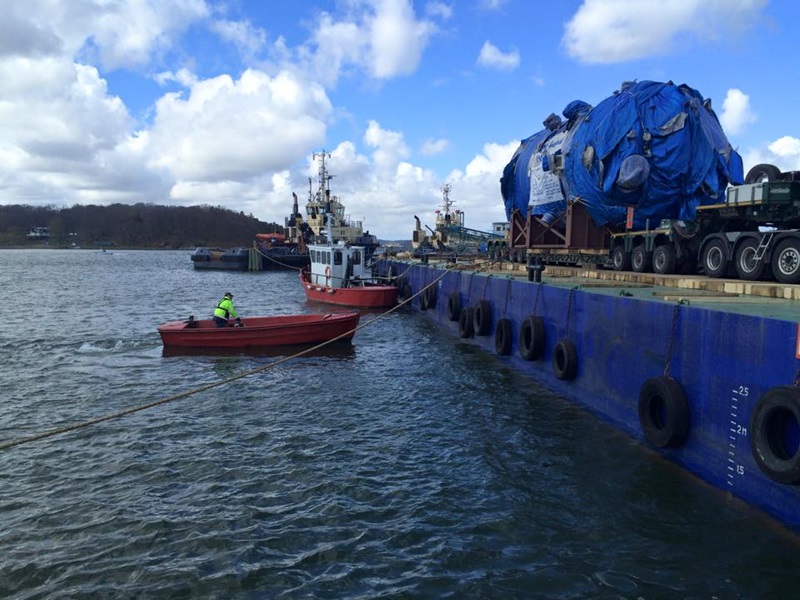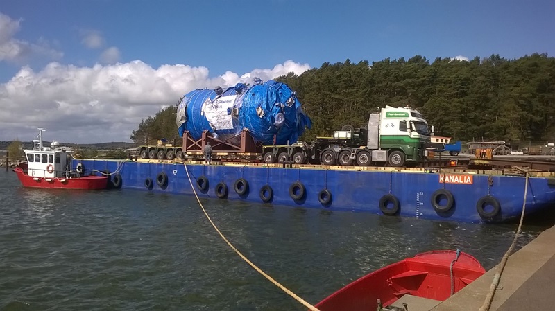 Den sist byggda BVB 10 nr 661 på väg att tycka in Sandinges pråm Kanalia lastad med en reaktor på 110 ton till en fabrik i Stenungsund.