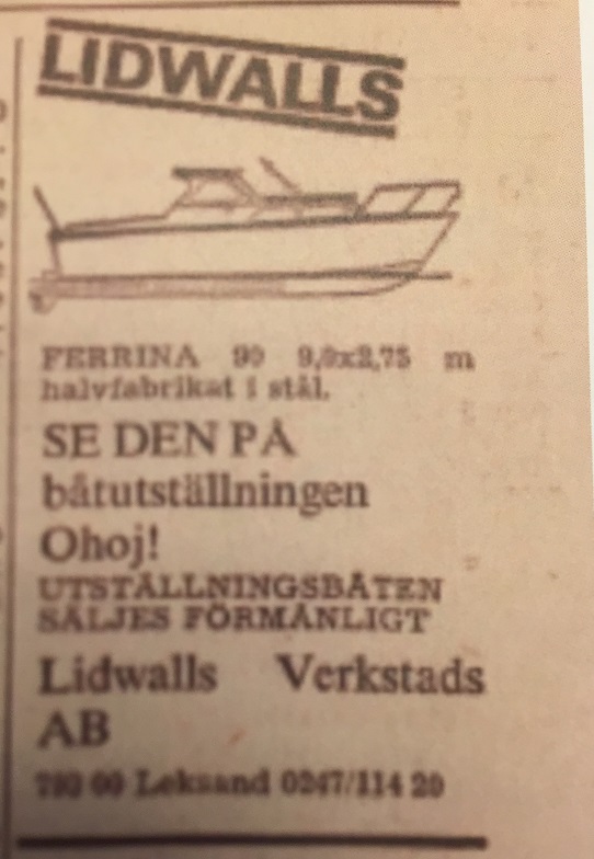 Här en annons för Lidwalls Verkstads AB och Ferrinan 90 på utställningen Ohoj införd i SvD. Mässan hölls i Älvsjö nuvarande Stockholmsmässan 1971 04 02.