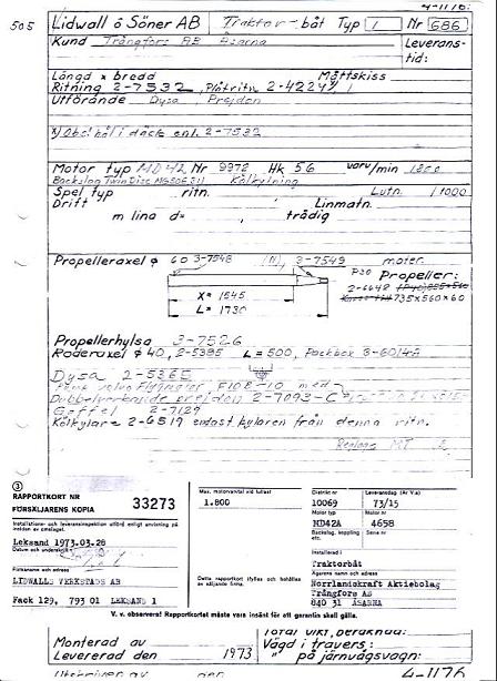 Har en typ 1 -traktorbåt "monitor" i fint skick. Har kopior på kvitto, levaransprov och även vissa konstruktionsritningar. Levererades 1973 till Norrlandskraft aktiebolag - Trångfors AB Åsarna. Leveranspappret antyder att serienumret är: 686
