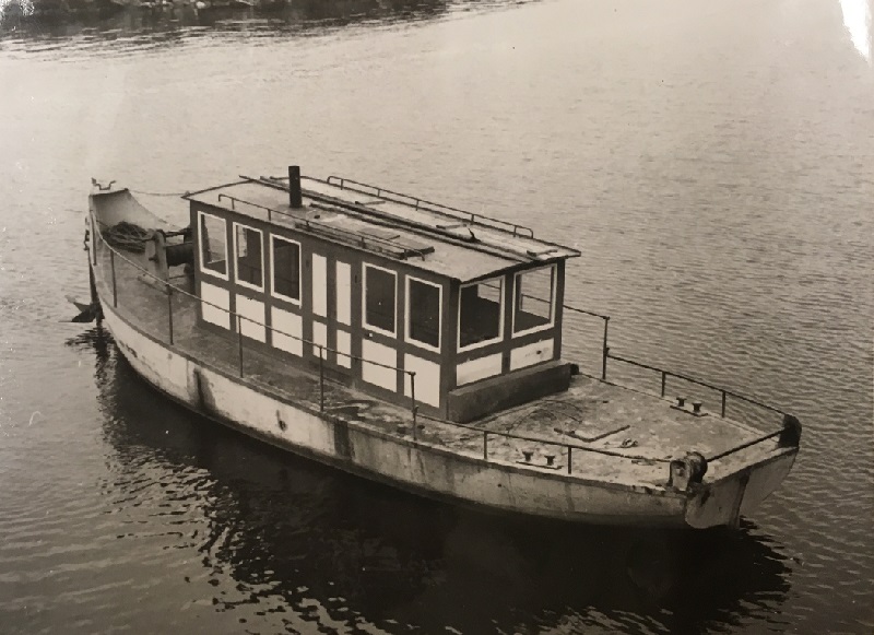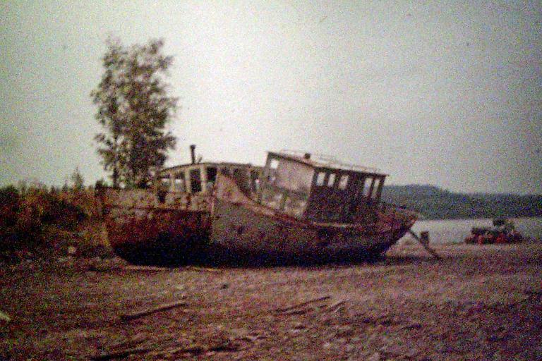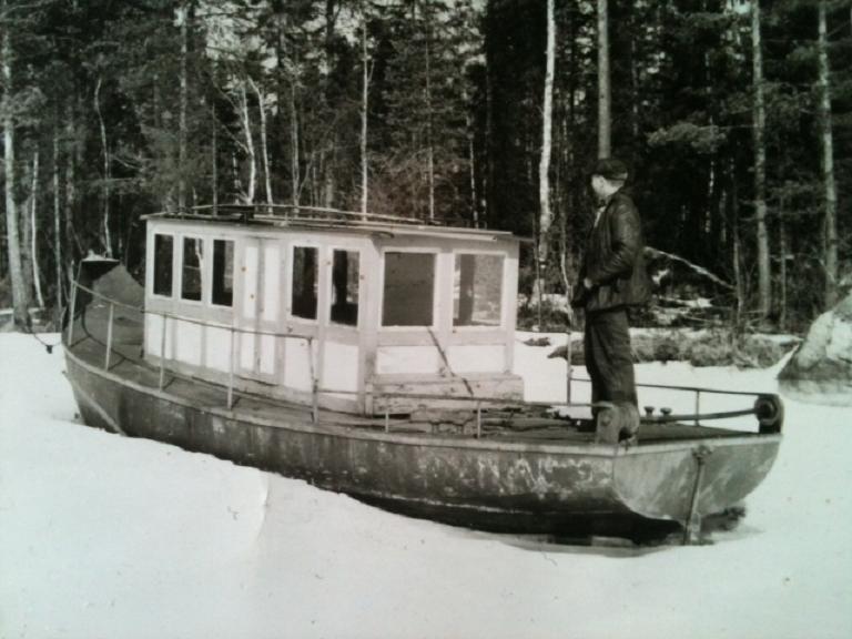 Väsman med havererad sefflemotor 1962 . På akterdäcket står Ture Stenkil som hade en verkstad i Grangärde. Motorn lyftes ur båten vid detta tillfälle och reparerades i Borlänge. Det blev en lyckad operation för det är samma motor som driver båten ännu 2018. Foto från Håkan Wennegard