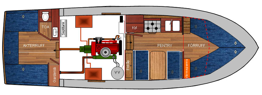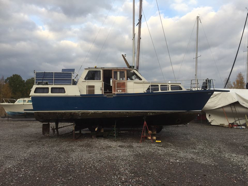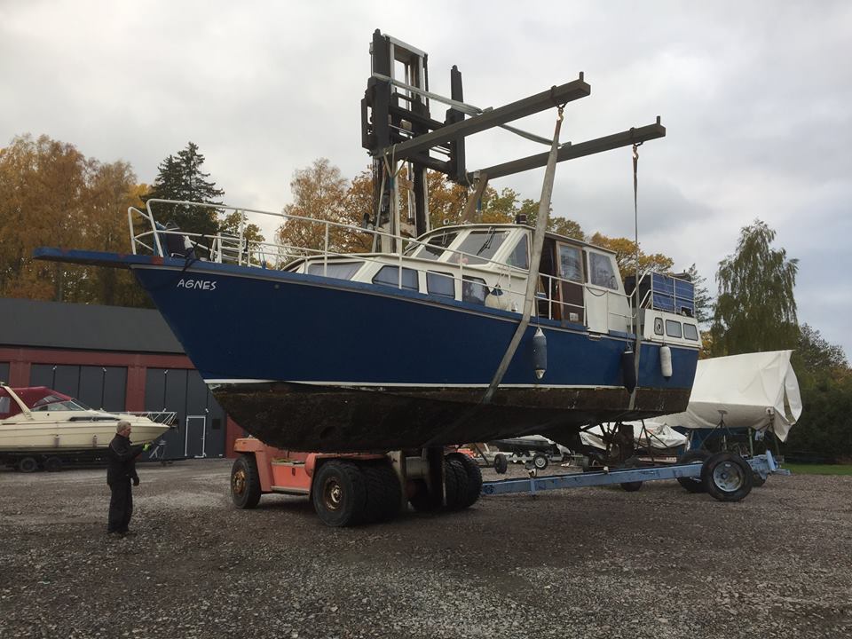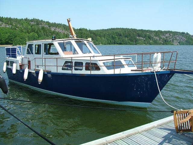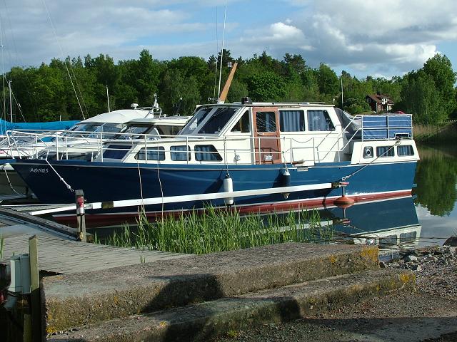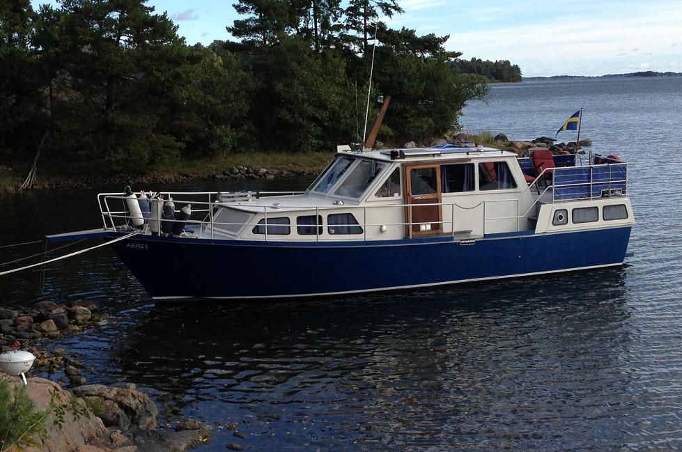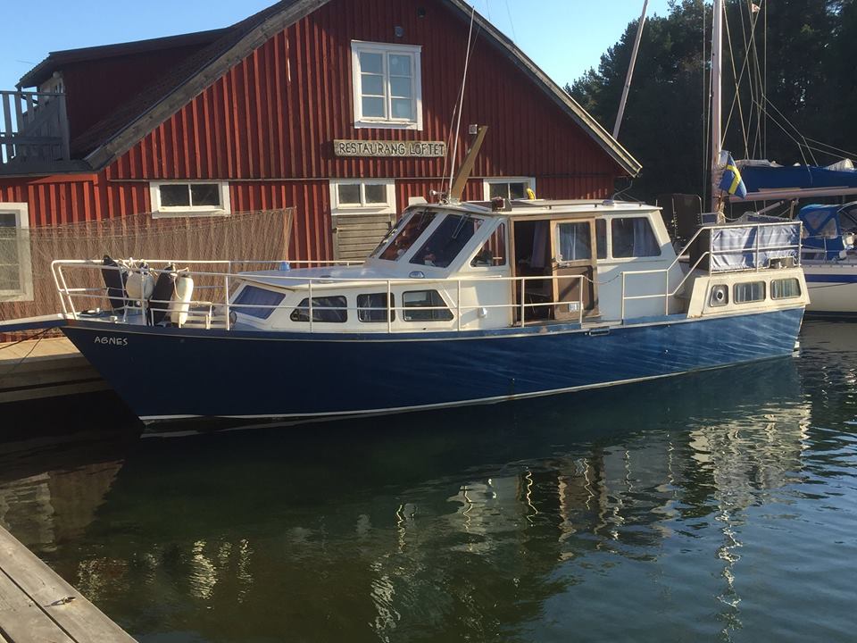 Hej! Denna sommar köpte jag en Ferrina av vår granne. Den mäter 10,20 x 3,10 meter, Det sitter en Perkins 6.354 i henne. "Marina" har hon hetat hela tiden, men vi döper nu om henne till "Agnes". Vår granne köpte båten som halvfabrikat från fabrik, och byggde resten på 3 år, De senaste åren har hon legat på land så fick vi möjligheten att köpa henne. Grannen har lagt ned ett otroligt arbete på båten och inte snålat på något. Bifogar en bild, som är 2 månader gammal, visst är hon tjusig?