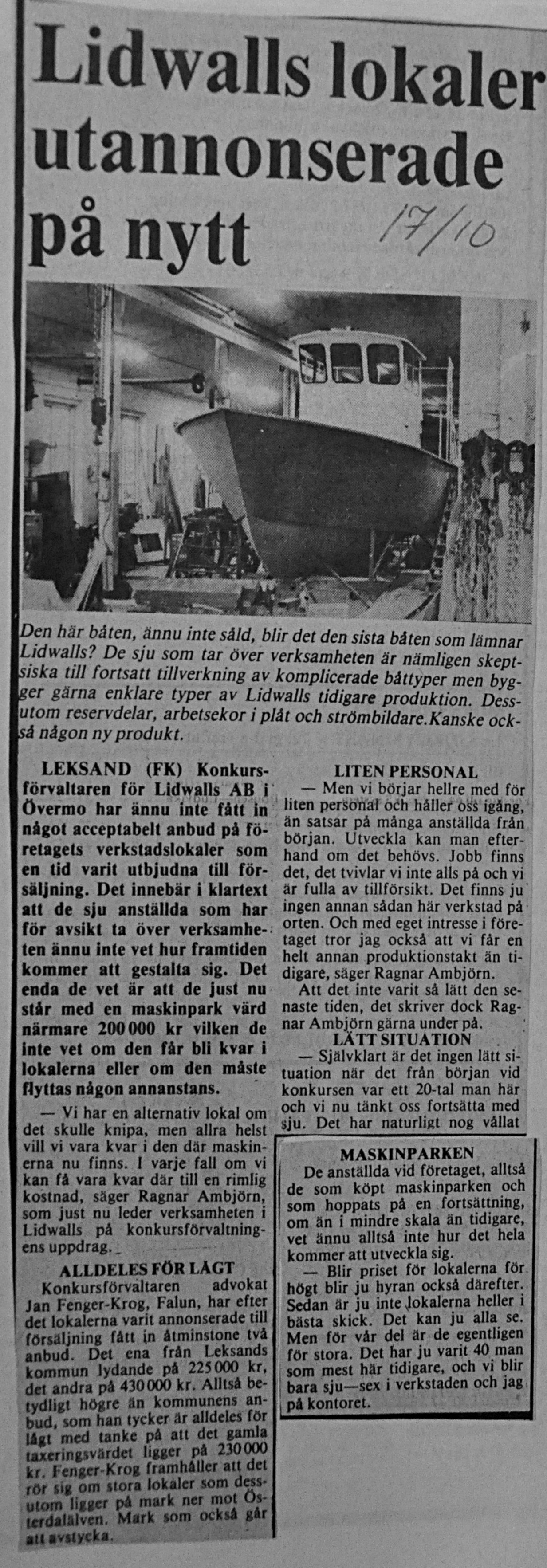 Lidwalls Verkstads AB levererade denna båt till okänd runt årskiftet 1980-81. Längd 9,3 m. Bredd 3,10 m. Motorn är en Ford 2715. Det är det enda vi för närvarande vet om denna båt som byggdes i en för företaget turbulent tid. Det blev också det sista Ferrinaskrovet som byggdes. Bilden är från ett klipp Falu Kuriren 1980 10 17 i Leksands Lokalhistoriska arkiv förmedlat genom Lars Jönses. Företaget hade ju slagit vantskruvarna i bordet i semesterperioden 1980 och förhandlingarna med konkursförvaltaren var inte slutförd av den konstellation som sedan blev Leksands Mekaniska.