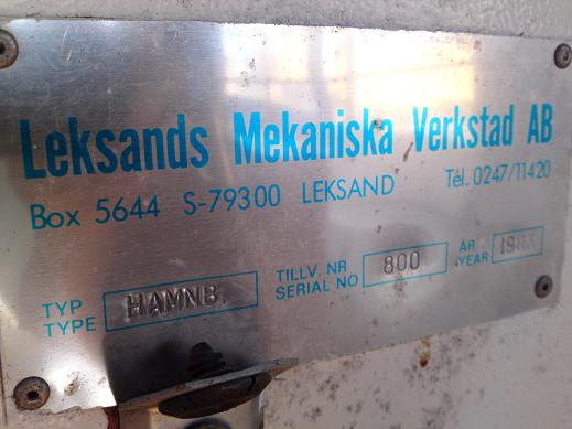 Tillverkningsskylten som sitter i båten. Observera företaget nu fått nya skyltar sedan man vid ägarbytet 1981 ändrade namn till Leksands Mekaniska Verkstads AB.