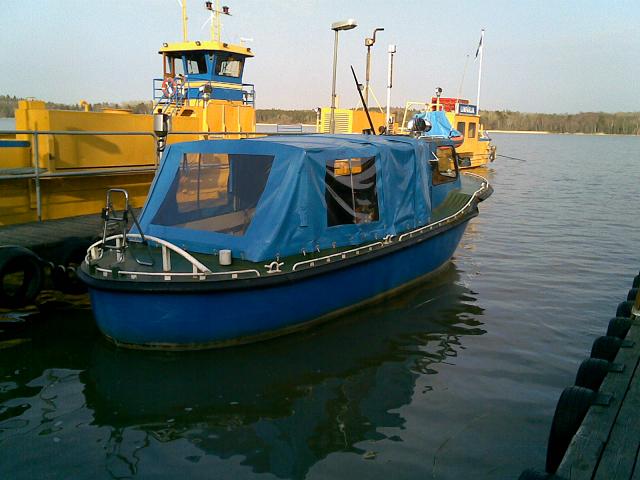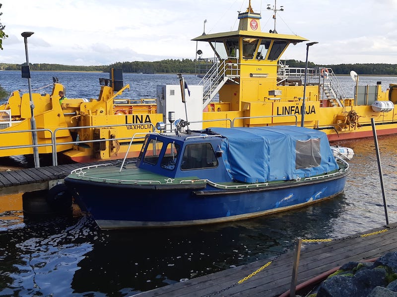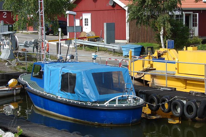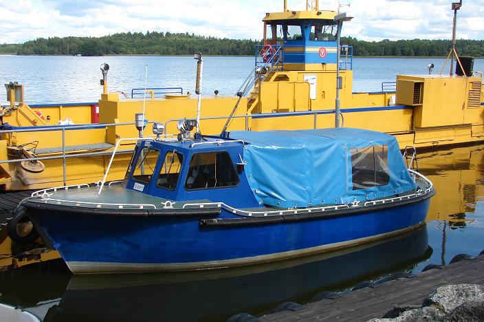 Hamnarbetsbåten nr 800 vid Oknö färjeläge Foto N. Lundqvist juni 2012