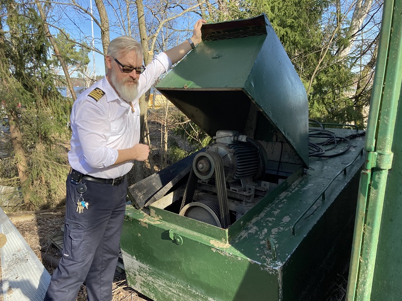Ena redaktionshalvan förstärkt med Christer Samuelsson företog en liten expediton till Aspö och färjelägret, där nr 800 finns. Vi träffade delar av personalen och Nisse Lundqvist visade oss innanmätet på en av strömbildarna typ P15 som tagits upp samma dag. Nu stundade underhåll och målning. Foto red. 2021 03 23