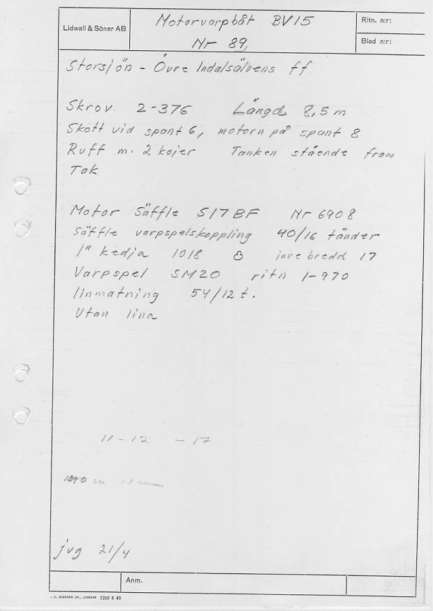 Lidwall & Söner AB levererade denna motorvarpbåt till Storsjön och Övre Indalsälvens Flottningsförening, Frösön den 21 april 1950. Längd 8,50 m. Bredd 2,50 m Seffle tändkulemotor typ S17 BF på 15 hkr med motornummer 6908 stod för kraften. Båten var utrustad med varpspel typ SM 20 och levererades per järnväg. Vid leveransen var båten försedd med plåttak och hade 2 kojplatser under fördäcket. Det är det enda vi vet om denna båt skrev vi i april 2014 då red fick bilder på båtens första motor.